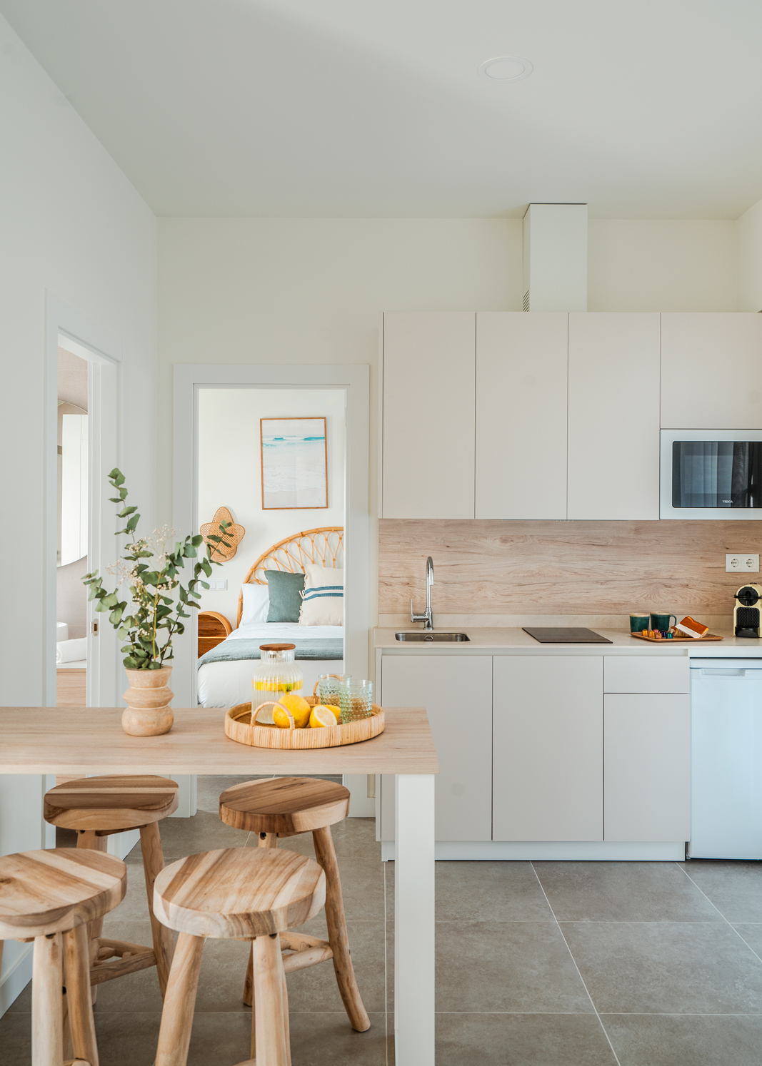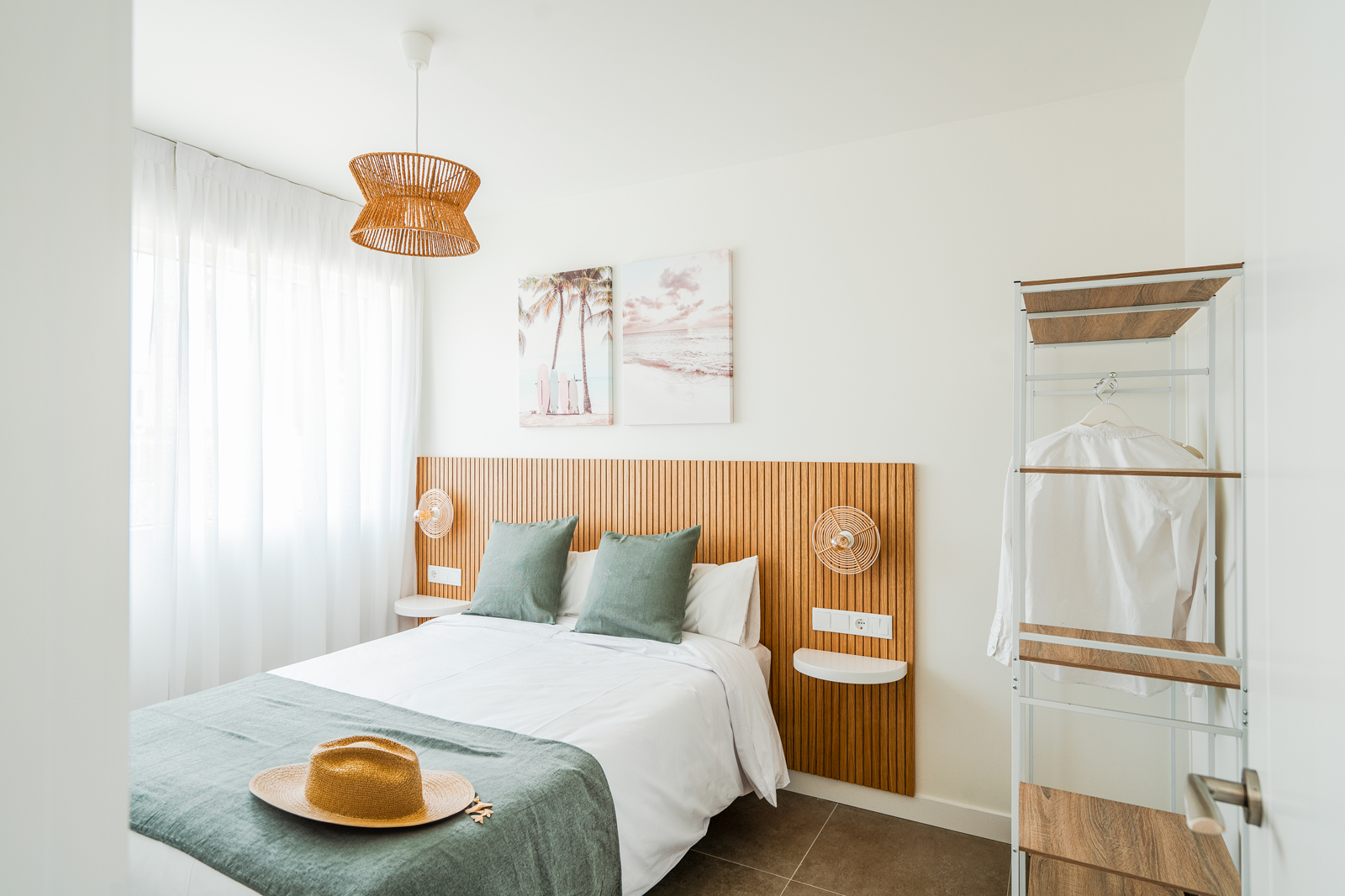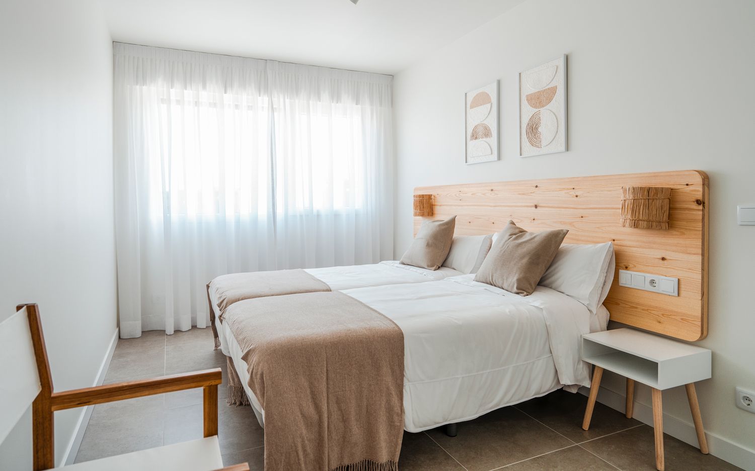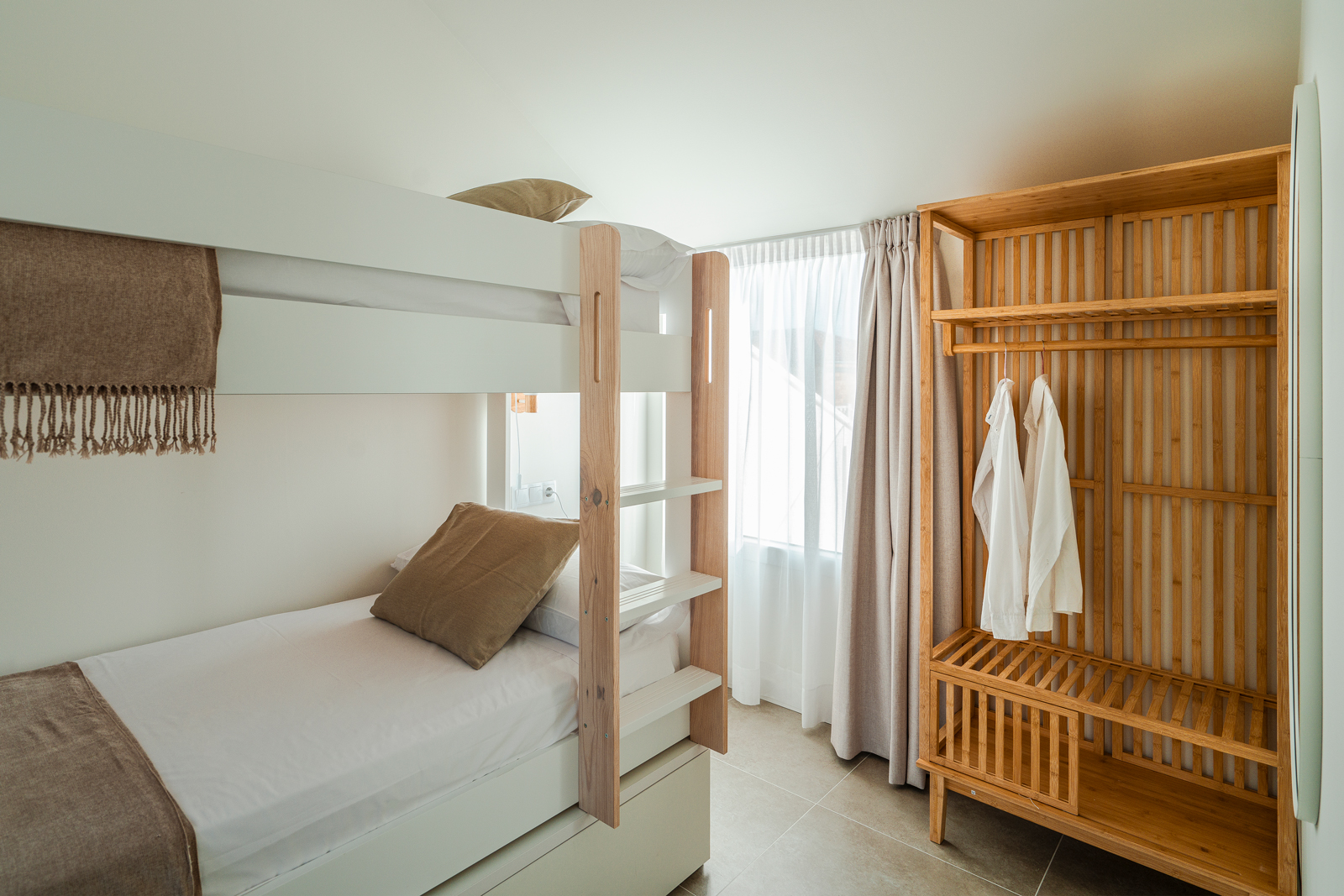 En la parte superior del nuevo edificio, con capacidad para 4 personas, cocina, salón comedor, baño y dos habitaciones, una con cama de matrimonio y otra con dos literas. Balcón con sillones y vistas a la playa. Amplia y soleada terraza, con mobiliario exterior.